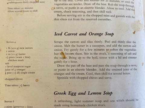 And there’s also a photo of a well worn, well used recipe for Carrot and Orange soup.